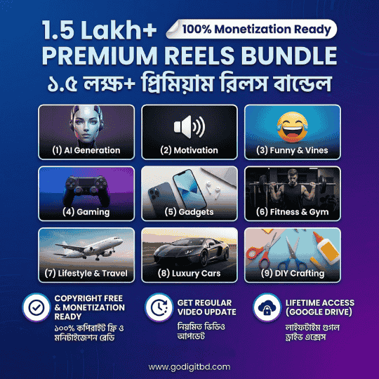 Go Digit BD নিয়ে এলো ১ লক্ষ ৫০ হাজারেরও বেশি রেডিমেড এবং কপিরাইট-ফ্রি প্রিমিয়াম রিলস বান্ডেল! “ভিডিও দিবো আমরা, আর আপলোড করে ভাইরাল করবেন আপনি।” আজই কিনে ডাউনলোড করুন এবং শুরু করুন আপনার পেজ মনিটাইজেশনের যাত্রা।